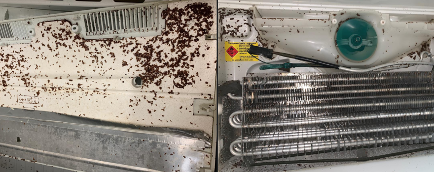 Customer’s fridge broke down but had to go away before they call us, unfortunately left the doors closed in the meantime... maggots invasion + moisture = corrosion damage -> gas leak! From bad to worse...